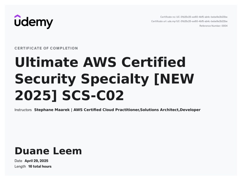 🎉 Just wrapped up Stephane Maarek’s “Ultimate AWS Certified Security Specialty (SCS-C02)” course on Udemy! 🚀